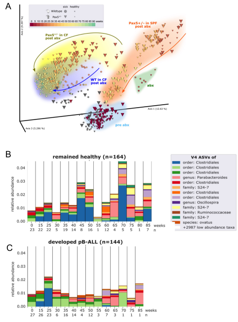 我們首先證實,抗生素治療后的微生物群落以一種依賴于基因型的方式再生,并且能夠隨著時間的推移而重建(圖5A)。接下來,我們將Pax5+/-發(fā)展為PB-ALL的小鼠的腸道微生物群與在整個實驗過程中保持健康的小鼠的腸道微生物群進行了比較。通過對所有時間點應(yīng)用離散FDR,我們確定了3983個已鑒定的V4-ASV中的42個在白血病前期Pax5+/-小鼠(n=144,糞便樣本)和健康Pax5+/-小鼠(n=164,糞便樣本)之間差異豐富(圖5B,C)。這些發(fā)現(xiàn)將遺傳易感性和耗盡的微生物群與那些將患上感染驅(qū)動的PB-ALL的Pax5+/-小鼠聯(lián)系在一起。綜上所述,這些發(fā)現(xiàn)表明腸道微生物群有可能被用作早期生物標(biāo)記物來識別易患白血病的遺傳易感小鼠。
