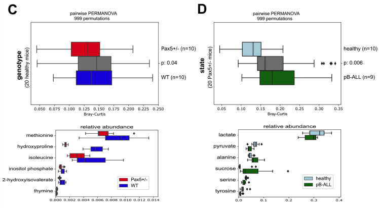 在這里,利用pB-ALL的小鼠模型,我們的結(jié)果表明,在生命早期抗生素治療引起的微生物群干擾足以在遺傳易感小鼠中誘發(fā)白血病,即使在沒有感染性刺激和獨立于T細胞的情況下也是如此。通過對一系列糞便樣品進行16S V4和16S rRNA全長測序,我們發(fā)現(xiàn)pB-ALL(Pax5雜合性或ETV6-RUNX1融合)的遺傳易感性形成了一個不同的腸道微生物群。使用3983個擴增序列變異(ASV)中的40個作為細菌物種的替代物,機器學(xué)習(xí)準確地預(yù)測了遺傳易感性(96.8%)。將野生型(WT)或Pax5+/-造血骨髓細胞移植到WT受體小鼠,發(fā)現(xiàn)微生物群是以供體基因型特異性的方式形成和確定的。氣相色譜-質(zhì)譜(GC-MS)分析來自WT和Pax5+/-小鼠的血清表明存在基因型特異性的獨特代謝組譜。綜上所述,我們的數(shù)據(jù)表明,是缺乏共生微生物群落,而不是特定細菌的存在,促進了遺傳易感小鼠的白血病。未來需要進行大規(guī)模的縱向研究,以確定對易患pB-ALL的兒童進行有針對性的微生物群落調(diào)整是否能成為一種成功的預(yù)防策略。