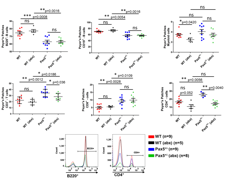 我們觀察到,在抗生素治療后通過細菌耗盡來改變微生物群并沒有改變Peyer氏斑中B細胞的數(shù)量,但與未治療的Pax5+/-小鼠相比,接受抗生素治療的Pax5+/-小鼠的CD3+-T細胞數(shù)量顯著減少(圖S25)。CD3+-T細胞的減少與抗癌免疫力的降低有關(guān)。因此,我們想知道T細胞數(shù)量的減少是否與接受抗生素治療的Pax5+/-小鼠的PB-ALL發(fā)展有關(guān)。我們將Pax5+/-小鼠與缺乏nu/nu小鼠的胸腺缺陷T細胞雜交。33只Pax5+/-;nu/nu小鼠中有5只(15%)觀察到PB-ALL發(fā)育,而WT;nu/nu對照組小鼠(n=31)均未觀察到PB-ALL發(fā)育。