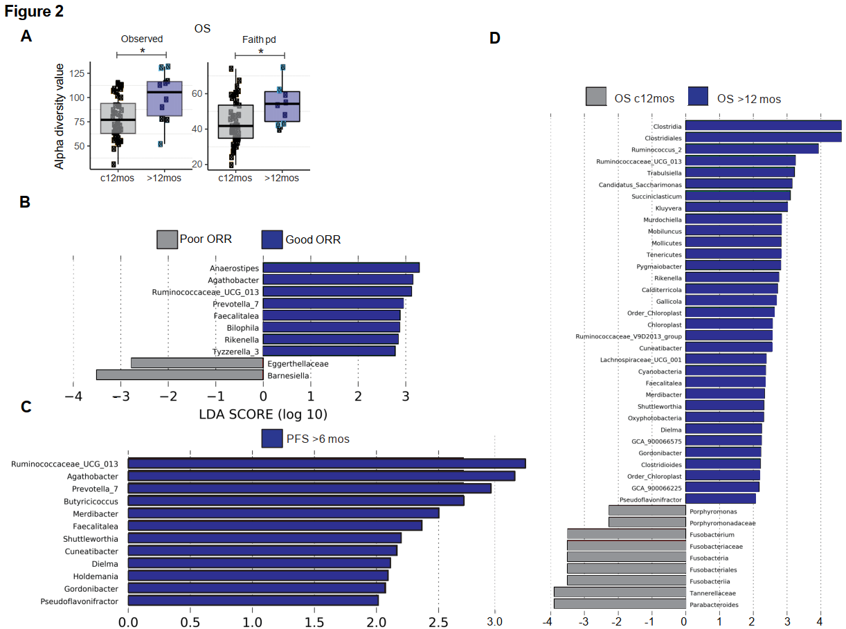 作者檢測的隊列中所有患者alpha多樣性在OS>12個月和OS<12個月的患者之間差異不顯著。依據(jù)臨床數(shù)據(jù)比較了組間GM的組成。在PFS>6個月的患者中,Ruminococcaceae UCG 13 ?Agathobacter富集。在OS>12個月的患者中Lachnospiraceae UCG 001富集。
