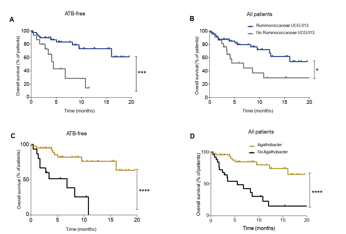 由于ATB的使用顯著改變了GM的組成,作者通過排除接受ATB治療的患者來描述GM組成。在無ATB組,alpha多樣性降低與較短的OS有關(圖2A)。在beta多樣性分析中沒有發(fā)現(xiàn)不同的clusters。Ruminococcaceae UCG 13Agathobacter在具有良好ORR和PFS>6個月的個體中富集(圖2B和2C)。Ruminococcaceae UCG 13在OS>12個月的患者中富集(圖2D)。在未接受ATB治療的患者中,Clostridiales order在OS>12個月的患者中富集(圖2D)。