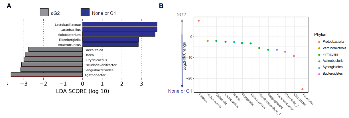 考慮到GM與irAE之間的可能存在聯(lián)系,作者分析了經歷臨床相關irAE的患者(>2級)和不嚴重的irAE患者(1級或無)之間的GM組成間的差異。在未接受ATB治療的患者和所有患者中,組間的細菌多樣性沒有差異。LEfSe分析中Lactobacillaceae和DESeq2分析中Raoultella?在未經歷嚴重irAE患者糞便中富集(圖4A和4B)。盡管Akkermensia與改善的臨床結果無關,但是其與較輕的irAE相關(圖4B)。
