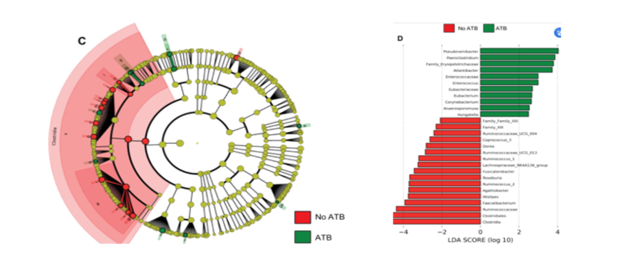 作者研究了ATB對GM組成的影響。ATB的使用與Shannon和Inverse Simpson指數(shù)減少有關(圖1A)。在分析ATB和無ATB組beta多樣性時,聚類到兩個clusters(圖1B)。未接受ATB治療的患者糞便中富集Clostridia,尤其是Ruminococcaceae UCG 13、Clostridiales?和?Agathobacter(圖1C)。而接受ATB治療的患者糞便中富集Hungatella(圖1D)。