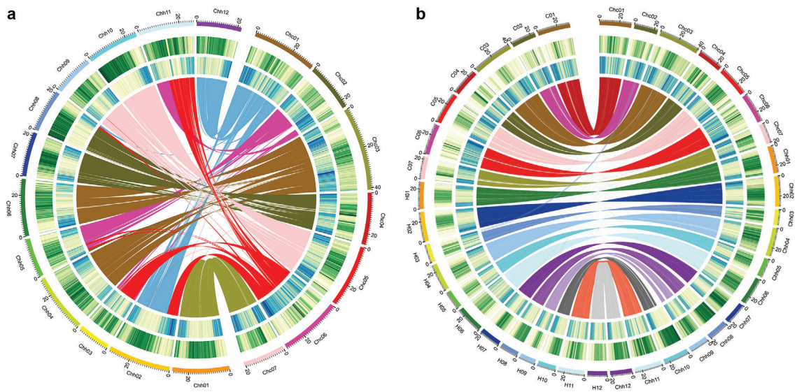 作者通過PacBio+BioNano+Hi-C+Illumina共組裝獲得530.8?Mb基因組(≈67%流式評估大??;≈77% survey評估大??;比對發(fā)現(xiàn)未裝出的為重復序列),contig N50=6.5?Mb,并將組裝的基因組序列掛載至19條假染色體上(掛載率97.23%;定序與定向率93.33%)(表1)。通過與二倍體C.sativus (CC)和C.hystrix(HH)染色體的C01–C07和H01–H12對應,將C.×hytivus染色體命名為Chc01–Chc07和Chh01–Chh12(圖1)。