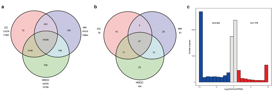 與已測序的栽培黃瓜基因組一樣,金瓜中大部分的TE為長末端重復序列。Chytivus(S14)的Chc亞基因組(SubC)含有的TEs少于二倍體C.sativus(CC)基因組,而Chh亞基因組(SubH)保持了幾乎相同的不同類型TEs的含量和比例。共預測了45687個基因,平均基因長3846bp,每個基因有5.26個外顯子。BUSCO評估結果為90.90%,CEGMA評估結果為97.82%。在CC和HH二倍體基因組中鑒定的18882個同源基因家族中,在C.×hytivus(S14)異源四倍體中也鑒定了18428個(97.60%)(圖2)。