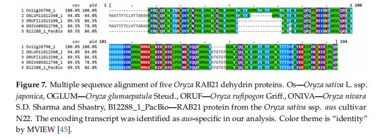 舉個例子,在高溫和干旱雙重脅迫下顯著上調(diào)的基因B12288。它在japonica和indica中均有同源基因RAB21,這個基因受干旱的誘導,其編碼的蛋白屬于LEA脫氫蛋白家族。與水稻其它脫氫蛋白進行多序列比對研究(圖7),N22實際上的基因與野生稻、O. sativa ssp. japonica中其它4種脫氫酶的親緣關(guān)系密切。序列覆蓋率為89.5%,序列同源性86.0%,其中包含脫氫酶高度保守的重復區(qū)。相比japonica蛋白,N22蛋白序列與野生稻更接近。