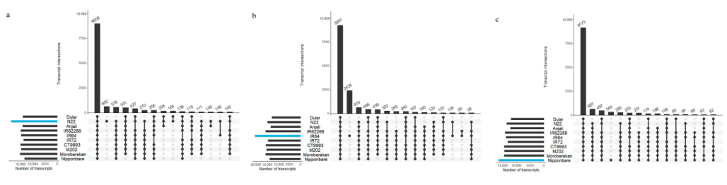 在過去的幾年里,RNA測序(特別是基于illumina的短序列RNA-seq)已經(jīng)成為分析轉(zhuǎn)錄組的有力工具,用來識別在非脅迫控制和各種環(huán)境脅迫條件下差異表達的基因。然而,需要基于參考基因組或轉(zhuǎn)錄組序列對RNA-seq數(shù)據(jù)進行比對和注釋來確定轉(zhuǎn)錄水平。在水稻中,參考基因組決定了可以鑒別的差異表達基因和轉(zhuǎn)錄本亞型。顯然,參考基因組/轉(zhuǎn)錄組中沒有的基因的表達信息在分析過程中會丟失。這在研究耐脅迫的外來品種、陸地品種或野生稻種時尤其相關(guān),因為它們可能含有參考品種Nipponbare不存在的耐受基因。這將嚴重限制識別支持作物改良計劃的新候選基因的可能性。