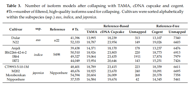 在文庫準備過程中,會產(chǎn)生5 ‘ RNA降解產(chǎn)物,并進行測序。這些降解產(chǎn)物具有相同的外顯子結(jié)構(gòu),但缺乏5 ‘序列信息,因此產(chǎn)生與技術(shù)偏差或生物學背景無關(guān)的冗余異構(gòu)體。我們測試了三種不同的去冗余方法,包括cogent、cDNA cupcake和TAMA,其中cDNA cupcake和TAMA需要基于參考基因組,而cogent不需要基于參考基因組。cogent基于pacbio全長轉(zhuǎn)錄本序列重構(gòu)一個參考基因組,然后將相同的序列比對到重建的基因組,基于比對結(jié)果利用cDNA cupcake算法對轉(zhuǎn)錄本去冗余。cDNA cupcake和TAMA直接用minimap2軟件和各自的亞種參考基因組進行比對?;谶@三種方法,只有很少的轉(zhuǎn)錄本不能回比到基因組上(表3)??偟膩碚f,這三種去冗余方法均能顯著減少異構(gòu)體的數(shù)量,分別為47.6% (cDNA cupcake,Nipponbare)和68.3%(cogent,Dular)。