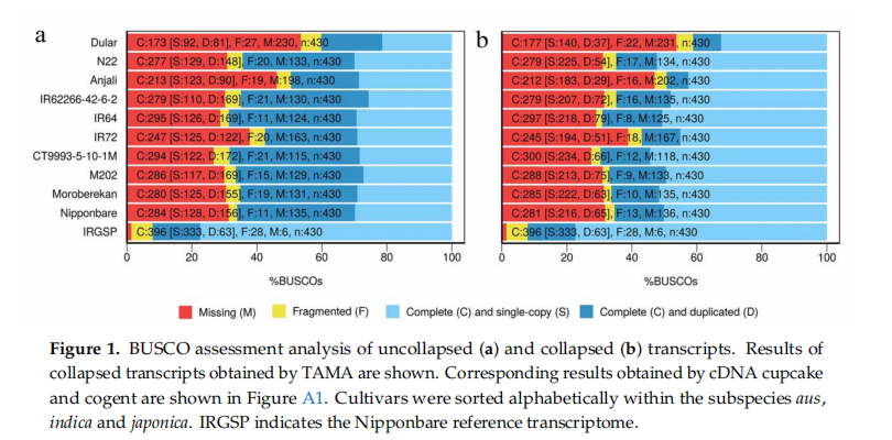 基于植物中430個高度保守的同源蛋白利用BUSCO軟件對TAMA算法去冗余前后的HQ進行完整性評估(圖一),由于取樣不完全,缺失了54%~27%的重要蛋白,其中Nipponbare參考基因組(IRGSP)只缺失了6種。cDNA cupcake和TAMA的結(jié)果相似,而對于cogent,超過50%的蛋白缺失,最有可能的原因是轉(zhuǎn)錄本沒有回比到重建的基因組。