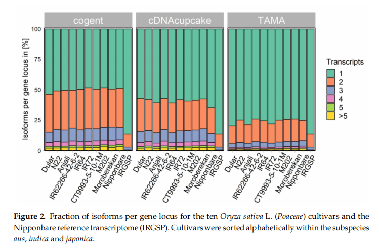 本文主要探討了Pacbio Iso-Seq獲得的轉(zhuǎn)錄本相比于Nipponbare參考基因組是否可以用于aus等水稻亞種的下游分析。此外通過這些轉(zhuǎn)錄本,我們希望發(fā)現(xiàn)水稻非生物脅迫下新的轉(zhuǎn)錄本和基因。我們的分析表明所有品種都可以鑒定出特異的轉(zhuǎn)錄本,還確定了aus亞種特異的差異表達基因。Pacbio Iso-Seq這種方法適用于其它沒有基因組或者基因組質(zhì)量不高的物種,相比對基因組組裝,這種方法更省時便宜。
