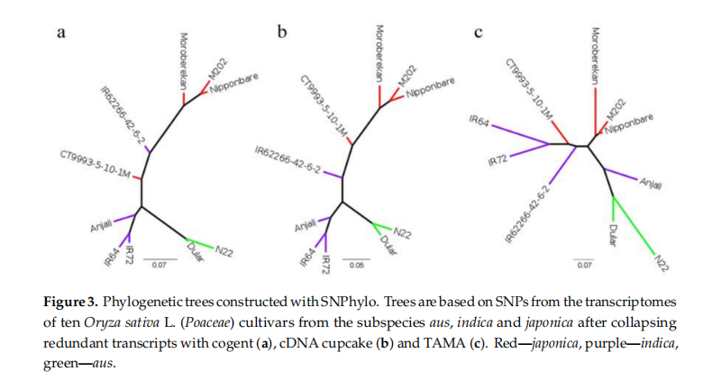來自同一亞種的不同品種親緣關(guān)系更近,我們使用系統(tǒng)發(fā)育樹評估亞種之間的遺傳距離。利用去冗余后的轉(zhuǎn)錄本序列基于Nipponbare參考基因組識別SNPs,使用SNPhylo繪制進化樹(圖3)。SNPhylo提取高質(zhì)量并且具有代表性的SNPs進行后續(xù)分析,cDNA cupcake算法大約30000個SNPs,cogent算法大約23200個SNPs,TAMA算法大約16000個SNPs。三種方法中,同一亞種的不同品種聚類在了一起,cDNA cupcake算法和cogent的聚類結(jié)果更相似。三種方法均能將aus與另外兩個亞種區(qū)分開,但cogent和TAMA對indica和japonica種間的區(qū)分不如cDNA cupcake明顯。