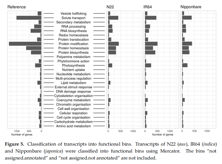 使用Trinotate和Mercator4進行功能注釋。Mercator4是專門為植物開發(fā)的,它使用了一種簡單的層次樹結(jié)構(gòu),被稱為“容器”,用來描述生物學概念。主要的生物過程如光合作用,都是由頂層的容器來表示的,每個子容器描述的是一個更詳細的子過程。目前本體包括27個功能類別,代表了植物中不同的生物過程。N22、IR64和Nipponbare三個品種作為各自亞種的代表與植物中所有水稻基因的分類進行比較分析,結(jié)果顯示三個品種的注釋結(jié)果分布相似(圖5)。超過28000個水稻已知基因在Mercator庫中沒有注釋分類信息,因此三個品種有8000~10000個轉(zhuǎn)錄本沒有分類注釋到Mercator庫。