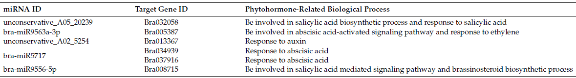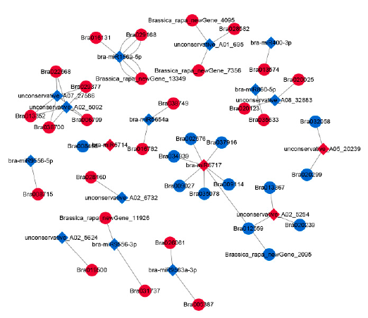 作者使用了TargetFinder來預(yù)測miRNA的靶基因,結(jié)合差異分析的結(jié)果最終得到170對miRNA和基因的調(diào)控關(guān)系,包含了18個miRNA和37個基因。對這些基因進行GO富集分析,發(fā)現(xiàn)主要是細胞過程、代謝過程等功能。對構(gòu)建的網(wǎng)絡(luò)進行研究發(fā)現(xiàn)miRNA所調(diào)控的基因主要是涉及糖代謝、脂質(zhì)代謝、花粉管生長等,同時也發(fā)現(xiàn)這些miRNA與植物激素相關(guān),比如bra-miR9556-5p可能通過靶向Bra008715來參與水楊酸介導(dǎo)的信號通路和油菜素類固醇生物合成過程途徑。