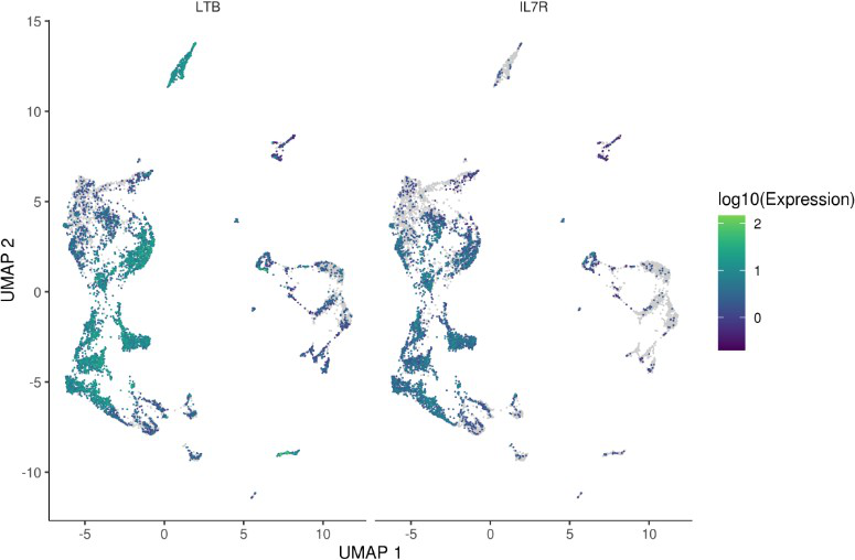 ?plot_cells(monocle_cds, genes=c(“LTB”, “IL7R”)) # 顯示某幾個基因的表達(dá)