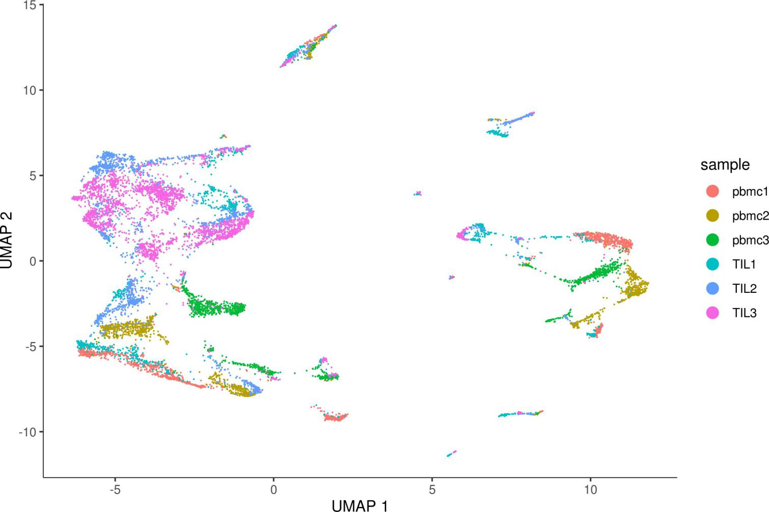 plot_cells(monocle_cds, color_cells_by=”sample”, label_cell_groups=FALSE) # 檢查樣本間的批次效應(yīng)