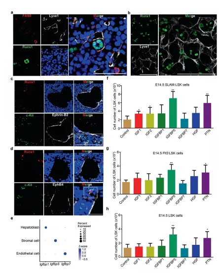 a 免疫熒光分析顯示了在 E14.5 FL 冷凍切片中 Lyve1(代表ECs)和 Runx1(代表 HSCs/MPPs)的表達(dá)。b免疫熒光分析顯示了 E14.5 FL 冷凍切片中 Lyve1(代表EC)和 Runx1(代表 HSCs/MPPs)的表達(dá)。c免疫熒光分析顯示 E14.5 FL 冷凍切片中 c-Kit(代表 HSCs/MPPs)、Runx1(代表 HSCs/MPPs)和 EphrinB2(代表動脈門脈血管)的表達(dá)。d免疫熒光分析顯示 c-Kit(代表 HSCs/MPPs)、Runx1(代表 HSCs/MPPs)和 EphB4(代表靜脈)在 E14.5 FL 冷凍切片中的表達(dá)。e Igfbp1、Igfbp5和Igfbp7在三種結(jié)構(gòu)生態(tài)位細(xì)胞(內(nèi)皮細(xì)胞、基質(zhì)細(xì)胞和成肝細(xì)胞)中的表達(dá)模式散點(diǎn)圖。f來自 E14.5 FL 的 100 個(gè) SLAM-LSK 細(xì)胞因子培養(yǎng)物的 HSCs/MPPs(LSK 細(xì)胞)的數(shù)量。g來自 E14.5 FL的 100 個(gè)Flt3-LSK 細(xì)胞因子培養(yǎng)物的 HSCs/MPPs(LSK 細(xì)胞)的數(shù)量。h來自 E14.5 FL 的 100 個(gè) LSK 細(xì)胞因子培養(yǎng)物的 HSCs/MPPs(LSK 細(xì)胞)的數(shù)量。
