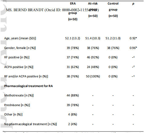 從2017年11月到2019年7月共納入了150名參與者,每組50人(表1)。ERA患者平均在確診為RNA后3.1±1.7個(gè)月入選。大部分ERA患者按照國(guó)家類風(fēng)濕關(guān)節(jié)炎藥物治療指南采用甲氨蝶呤治療,多與強(qiáng)的松聯(lián)合治療(表1)。