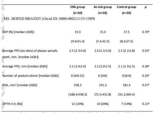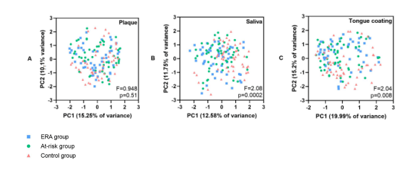 方法:招募三組(每組50人):ERA患者、高危個(gè)體和健康對(duì)照。牙周檢測(cè)結(jié)果為探診出血評(píng)分(BOP)、袋探診深度評(píng)分(PPD)和牙周炎癥表面積評(píng)分(PISA)。采用16S rDNA擴(kuò)增子測(cè)序評(píng)估齦下牙菌斑、唾液和舌苔的微生物組成,并采用PERMANOVA進(jìn)行組間差異分析。