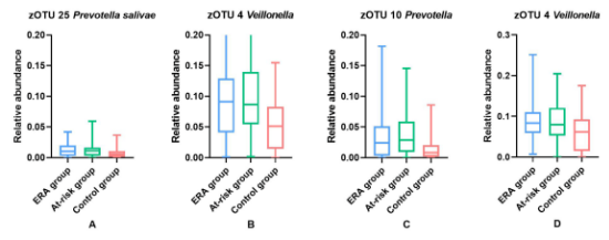 ? ? ? ? 在早期類風(fēng)濕關(guān)節(jié)炎患者和RA風(fēng)險(xiǎn)個(gè)體中,唾液和舌苔微生物組成與年齡性別相匹配的健康對(duì)照差異顯著,牙菌斑則差異不顯著。與健康對(duì)照組相比,ERA患者和高危個(gè)體唾液中PrevotellaVeillonella(均為革蘭氏陰性厭氧菌)相對(duì)豐度較高,舌苔中Veillonella相對(duì)豐度較高。然而唾液中也存在另一種zOTU鑒定為Veillonella的不同種,與其他兩組相比對(duì)照組相對(duì)豐度更高。
