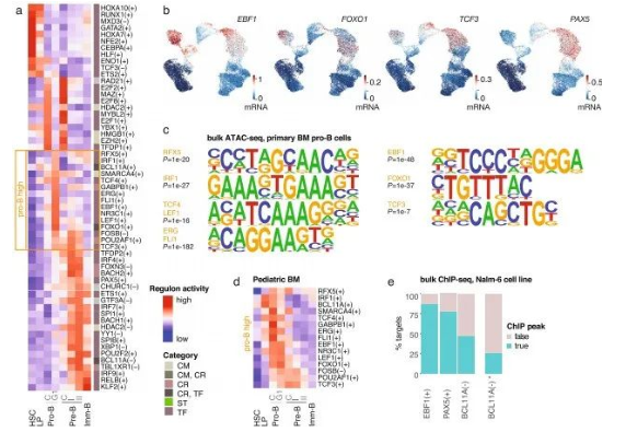 作為獨立驗證,首先從pro-B細(xì)胞中檢索了大量ATAC-seq數(shù)據(jù),顯著富集的TF motif證實了與pro-B G1期細(xì)胞相關(guān)的9個TF(EBF1、FOXO1、TCF3、RFX5、IRF1、TCF4、LEF1、ERG、FLI1)(圖 2c)。pro-B活性TF在兒童BM數(shù)據(jù)集中也具有高度相似的活性譜(圖 2d)。接下來,分析了包括TF與目標(biāo)基因表達(dá)相關(guān)性,以及每個目標(biāo)基因位點的TF motif。根據(jù)發(fā)現(xiàn)集中找到的TF,在訓(xùn)練/測試集中預(yù)測它們的靶基因。為了測試預(yù)測的靶基因是否受TF調(diào)控,本研究檢索了PAX5、EBF1和BCL11A的ChIP-seq數(shù)據(jù),這些數(shù)據(jù)在人類細(xì)胞系模型 Nalm-6中可用,使用GREA T獲得與基因關(guān)聯(lián)的peak。對于PAX5和EBF1,超過75%的預(yù)測目標(biāo)具有ChIP-seq peak關(guān)聯(lián)(圖 2e)。ATAC-seq motif富集與基于ChIP-seq的TF靶基因位點驗證,結(jié)果高度一致,證明TF活性評分反映了調(diào)節(jié)作用。說明本研究對健康人BM單細(xì)胞轉(zhuǎn)錄組的分析為基因表達(dá)和TF活性變化提供了全面的參考,這些變化表征了單細(xì)胞分辨率下早期B細(xì)胞譜系分化的特征。
