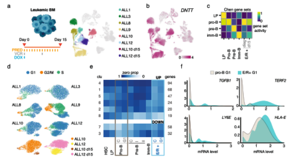 基于在ALL10和ALL12中誘導(dǎo)治療中期獲得的scRNA-seq譜分析了標(biāo)準(zhǔn)白血病誘導(dǎo)治療(潑尼松龍、長春新堿、多柔比星)對 TF表達(dá)的影響(圖 5d)?;诓町惙植挤治觯c兩個樣本中的診斷時狀態(tài)相比,來自第15天骨髓的殘余白血病母細(xì)胞具有較低的RUNX1、TCF3、SOX4和ERG表達(dá),而SMAD1和ELK3水平略有增加。在第29天誘導(dǎo)結(jié)束時,ALL10的原始細(xì)胞減少(0.08%)。在第15天,pre/未成熟B TFs POU2F2、KLF2/6、AFF3和SPIB在ALL10的剩余白血病細(xì)胞(10%原始細(xì)胞)中的表達(dá)升高。這些變化可能與糖皮質(zhì)激素的分化誘導(dǎo)作用有關(guān)。但總體而言,TF活性或基因表達(dá)的變化不大,表明盡管成熟CD20(由MS4A1編碼)增加,但僅可能發(fā)生向pre-B細(xì)胞狀態(tài)的部分分化。相比之下,ALL3和ALL12對治療的反應(yīng)緩慢(第 15 天的原始細(xì)胞率為74%和59%;誘導(dǎo)結(jié)束時分別為0.16%和0.2%)。ALL3與其他E/R+病例相比,診斷時細(xì)胞周期狀態(tài)分布強烈偏向G0/G1狀態(tài)(圖 3d),這可能是對靶向分裂細(xì)胞的藥物(阿霉素/長春新堿)耐藥的基礎(chǔ)。ALL12第15天TF譜表明白血病基因調(diào)控程序的持續(xù)性,表現(xiàn)為缺乏pre-/未成熟B TF上調(diào)(圖 5d)。