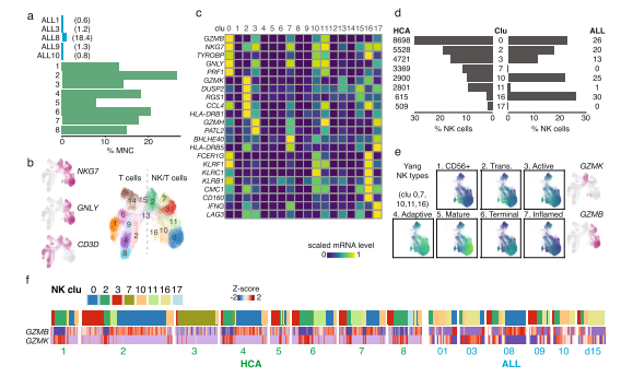 為了進一步表征免疫細(xì)胞群,將HCA和E/R+ ALL供體的T細(xì)胞和NK細(xì)胞匯集在一起進行聯(lián)合分析。基于聚類和marker基因分析,可以區(qū)分幾種不同的NK細(xì)胞類型(圖 4b、c)。篩選表達(dá)GNLY或NKG7的cluster(cluster 0、2、3、7、10、11、16),發(fā)現(xiàn)與來自HCA供體的NK細(xì)胞相比,來自ALL BM的NK細(xì)胞被隨機分配給這些cluster(圖 4d)。具體來說,所有NK細(xì)胞主要代表cluster 10和16,它們與表達(dá)未成熟CD56bright 和過渡NK細(xì)胞的顆粒酶 K(GZMK)相匹配(圖 4e 中的基因組評分代表來自scRNA-seq研究的NK亞型)。相比之下,大多數(shù)正常 BM NK細(xì)胞代表表達(dá)顆粒酶 B(GZMB)和穿孔素(PRF1)的成熟或終末NK細(xì)胞(cluster 0)。因此,E/R+白血病細(xì)胞可能會主動逃避NK細(xì)胞的細(xì)胞毒性,然而,NK類型的頻率因供體而異(圖 4f)。高表達(dá)IFNG的cluster 7幾乎完全對應(yīng)于HCA供體 3,而與其他ALL病例相比,細(xì)胞周期高度活躍的ALL8和ALL9更類似于正常BM中的成熟或活性NK細(xì)胞譜??傊?,白血病細(xì)胞狀態(tài)與正常pro-B分化狀態(tài)的不同之處在于干/祖細(xì)胞特異性基因和幾種免疫調(diào)節(jié)基因的高表達(dá)。免疫調(diào)節(jié)基因的變化反映為E/R+ BM內(nèi)更多不成熟的NK細(xì)胞類型。