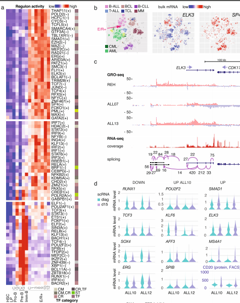 基于bulk RNA分析可以驗證它們在B-ALL中的表達(dá),在E/R+亞型(紅色箭頭)中檢測到的比例*高,如在t-SNE圖上比較血液系統(tǒng)惡性腫瘤所示(圖 5b),其中惡性淋巴瘤在圖上突出顯示。兩種常見的B-ALL亞型(E/R+和高超二倍體病例)顯示出類似的高ELK3,而升高的SP4則更具 E/R 特異性,進一步分析了E/R+細(xì)胞中的這些TF基因座(圖 5c)。本研究使用GRO-seq對E/R+ BM中的新生轉(zhuǎn)錄進行了分析,揭示了Pol2參與編碼和非編碼區(qū)的主動起始和延伸。GRO-seq 證實了這些基因位點在 E/R+細(xì)胞中的轉(zhuǎn)錄活性(圖 5c)。此外,還揭示了ELK3上游未注釋(Refseq、UCSC 或 Gencode)的轉(zhuǎn)錄起始位點(TSS)(圖 5c)。兩個lncRNA庫在該基因組區(qū)域內(nèi)具有匹配的轉(zhuǎn)錄本,但注釋之間的一致性很差。因此,在E/R+ BM(n = 8,scRNA-seq 和 GRO-seq 分析中的匹配樣本)中使用配對的bulk RNA-seq 進一步檢測了該基因座內(nèi)的剪接模式。帶注釋的ELK3轉(zhuǎn)錄本具有來自剪接點跨越reads的支持,而上游轉(zhuǎn)錄本與lncRNA結(jié)構(gòu)*匹配(圖 5c)。