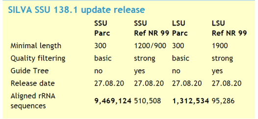 SILVA是一個包含三域微生物(細(xì)菌、古菌、真核)rRNA基因序列的綜合數(shù)據(jù)庫,其數(shù)據(jù)庫涵蓋了原核和真核微生物的小亞基rRNA基因序列(簡稱SSU,即16S和18SrRNA)和大亞基rRNA基因序列(簡稱LSU,即23S和28SrRNA)。目前數(shù)據(jù)庫版本為SILVA 138.1,更新時間為2020年9月2日,數(shù)據(jù)庫包含的數(shù)據(jù)信息見下表1所示。