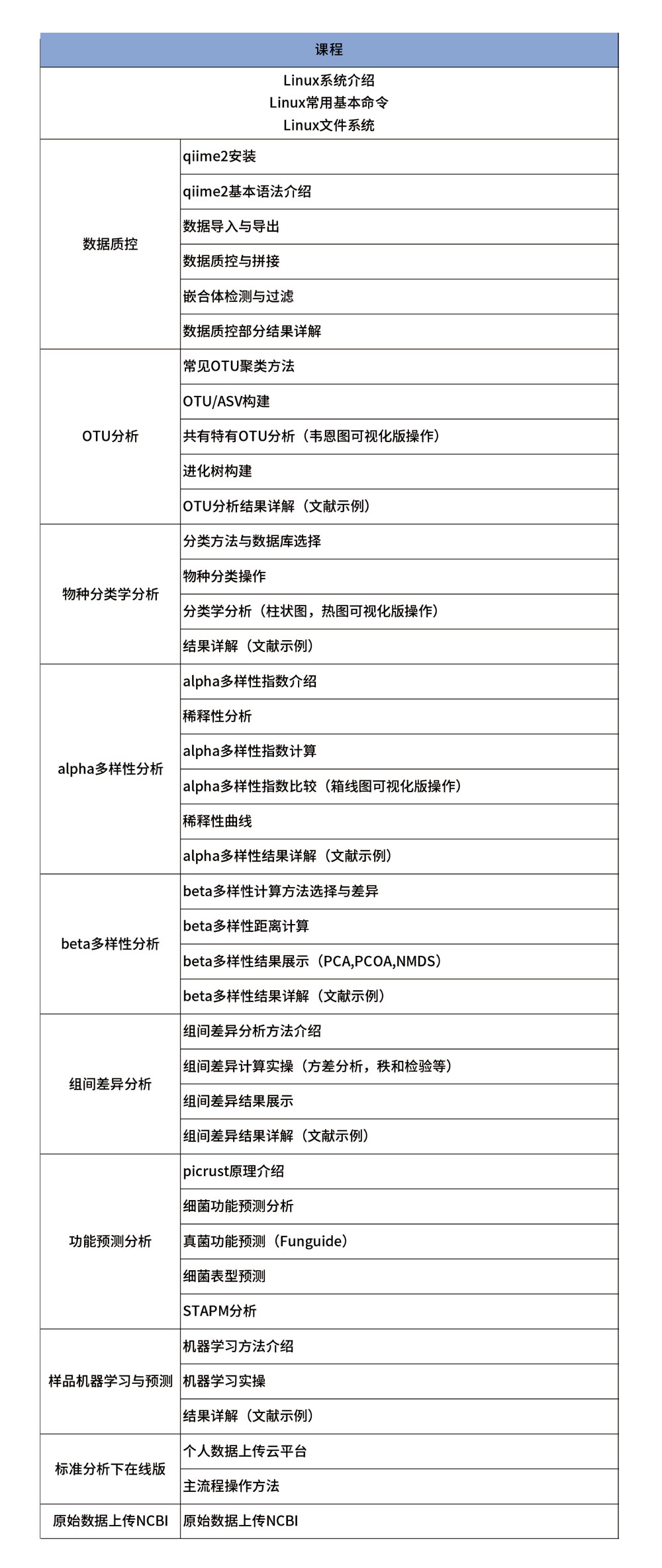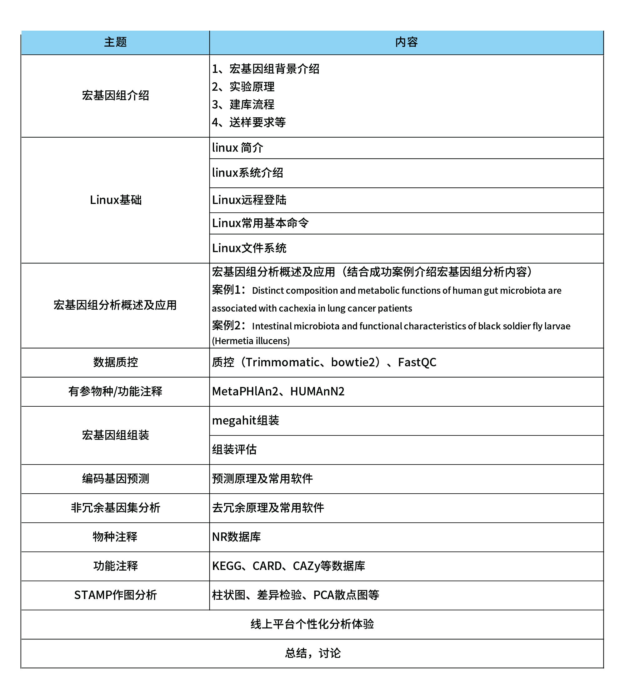 本課程從IF=10及4分的SCI文章入手,從宏基因組背景介紹、實驗(實驗測序原理、建庫方法和流程、送樣注意事項等)、分析(下機數(shù)據(jù)質(zhì)控、有參注釋、無參組裝/預(yù)測/物種注釋/功能注釋等)、可視化作圖,讓您全面了解宏基因組分析每個過程,并結(jié)合案例文章,讓您了解宏基因組文章思路,助力科學(xué)研究。