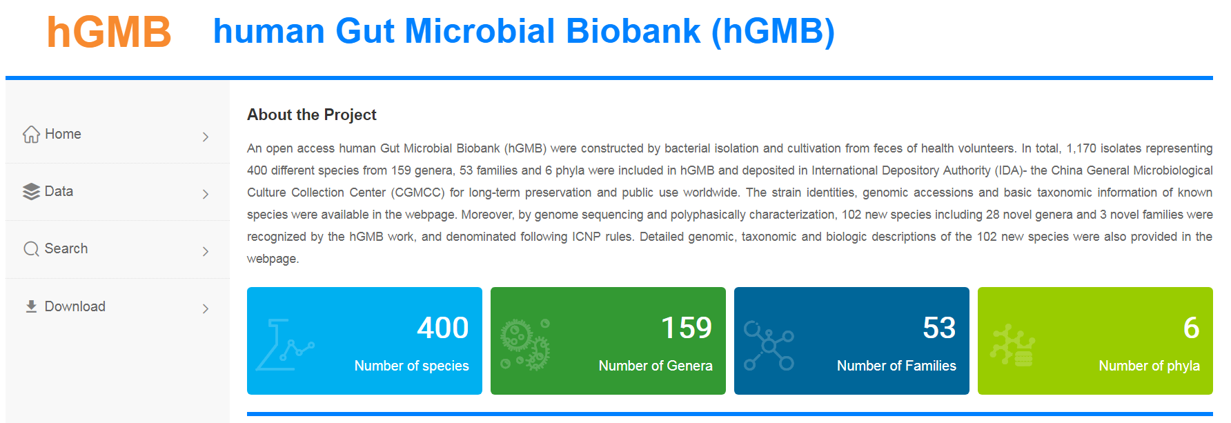 2021年5月,中科院微生物所通過從健康志愿者糞便中分離培養(yǎng)細(xì)菌,構(gòu)建了一個開放獲取的人類腸道微生物庫(hGMB)。數(shù)據(jù)庫共有1170個菌株,代表6門53科159屬400個不同物種。并保存在國際保存機構(gòu)(IDA)-中國微生物培養(yǎng)總收集中心(CGMCC),以便在全球范圍內(nèi)長期保存和公共使用。該網(wǎng)站提供了已知物種的菌株身份、基因組材料和基本分類信息。根據(jù)國際原核生物命名規(guī)則,對102個新種進行了特征描述和命名,提出了28個新屬和3個新科。hGMB代表了全球人類腸道16S rRNA基因擴增子數(shù)據(jù)(n=11647)中80%以上的常見和優(yōu)勢人類腸道微生物屬和種。