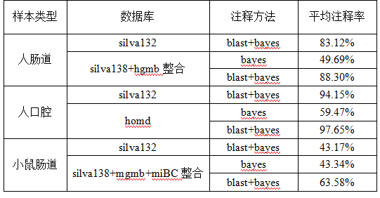 ? ? ? ? 結(jié)果表明,其中物種注釋方法方面:blast+bayes方法優(yōu)于bayes,平均提升30%注釋率提升:采用blast+bayes,silva132數(shù)據(jù)庫比較,平均提升9.7%,其中人腸道提升5.18%,口腔提升3.5%,小鼠腸道提升20.41%。其中人腸道樣本使用silva138+hgmb整合數(shù)據(jù)庫種水平注釋結(jié)果,人口腔樣本使用homd數(shù)據(jù)庫種水平注釋結(jié)果,小鼠腸道選擇silva138+mgmb+miBC整合數(shù)據(jù)庫。