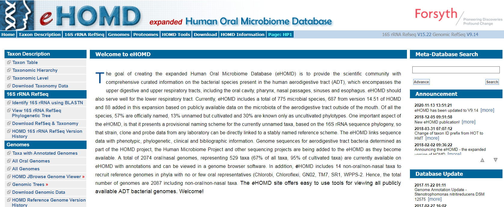 目前,eHOMD共包括775種微生物,其中687種來自HOMD 14.51版,88種是根據(jù)口外空氣消化道微生物群的公開可用數(shù)據(jù)在本次擴展中添加的。在所有物種中,57%是正式命名的,13%是未命名的(但可人工培養(yǎng)),30%是無人工培養(yǎng)型。eHOMD將序列數(shù)據(jù)與表型、系統(tǒng)發(fā)育、臨床和文獻信息聯(lián)系起來,共有2074個口腔/鼻腔基因組,代表529個分類群(占所有分類群的67%,占培養(yǎng)分類群的95%)。目前可在eHOMD上獲得,并帶有注釋,可在基因組瀏覽器軟件中查看。作為HOMD項目、人類微生物組項目和其他測序項目的一部分確定的空氣消化道細(xì)菌的基因組序列將在可用時添加到eHOMD中。更新時間為2020-11-13?版本V9.14。