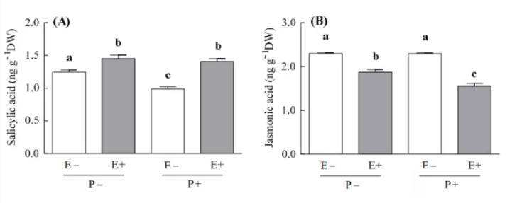 結(jié)果表明內(nèi)生真菌增加了植物SA濃度,與未接種病原菌的植株相比,內(nèi)生真菌增加了2倍的SA濃度(P+和P植物的內(nèi)生真菌分別使SA增加30%和14%)。與 SA 相反,內(nèi)生真菌降低了植株中JA濃度。接種病原菌的內(nèi)共真菌生植物與未接種的進行比較,茉莉酸的濃度降低了2倍。內(nèi)生真菌導(dǎo)致JA 濃度的減少,對于 P+和 P-植物分別為 32% 和 18%;