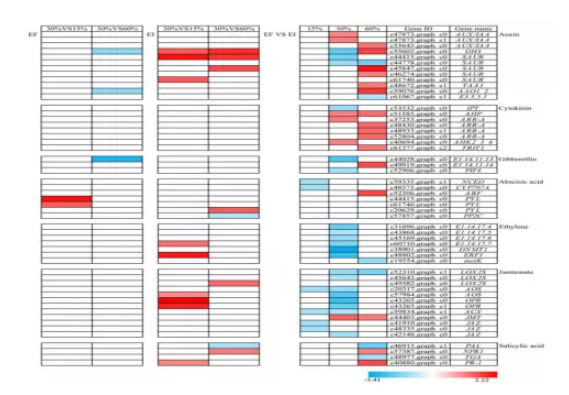 根據(jù)不同處理下的分析,我們共發(fā)現(xiàn)了 51 個與激素生物合成和反應(yīng)途徑相關(guān)的 DEG。包括12個IAA相關(guān)基因、8個CTK相關(guān)基因、3個GA相關(guān)基因、7個ABA相關(guān)基因、7個ET相關(guān)基因、12個JA相關(guān)基因和4個SA相關(guān)基因。