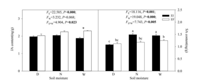 內(nèi)生真菌的存在與否,醉馬草內(nèi)生真菌相互作用對JA和SA均有含量有顯著影響。在60% 土壤水分含量下,醉馬草JA 含量EF顯著高于 EI。在 EI 或 EF 植物中,土壤水分含量對 JA 含量沒有顯著影響。對于 EI 植物,三種土壤含水量處理的 JA 水平同樣低。對于 EF 植物,只有在 15% 的土壤水分含量時,JA 水平與 EI 植物一樣低。在 30% 和 60% 的土壤水分含量下,醉馬草EF的SA含量顯著高于EI。醉馬草EI在30%和60% 土壤水分含量下的 SA 含量顯著高于15%土壤水分含量。