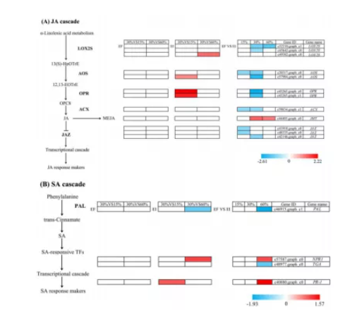 分析不同處理下,與JA和SA生物合成和反應(yīng)途徑相關(guān)的DEGs。發(fā)現(xiàn)了12個參與α-亞麻酸代謝和JA介導(dǎo)的信號通路的基因和4個參與苯丙氨酸和SA介導(dǎo)的信號通路的基因。JA和SA生物合成和反應(yīng)途徑的關(guān)鍵基因,如LOX2S、AOS、OPR、ACX、JMT、JAZ、PAL、NPR1、TGA和PR-1,表現(xiàn)出不同程度的上調(diào)或下調(diào)。