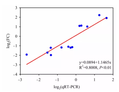 選擇了 13 個 DEG 進行 qRT-PCR 分析。線性回歸分析檢測到 qRT-PCR 和 RNA-seq 結(jié)果之間呈正相關(guān),相關(guān)系數(shù)為0.8。因此,本研究中的 RNA-seq 結(jié)果準(zhǔn)確可靠。
