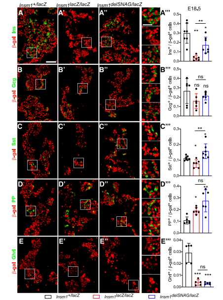 通過β-gal(lacZ等位基因的表達(dá))染色,觀察到Insm1delSNAG突變體的胰腺在E18.5時(shí)胰島素陽性β細(xì)胞數(shù)量減少,但是沒有像Insm1 null突變小鼠中那么嚴(yán)重(圖1A–A”’)。與對(duì)照相比,在Insm1delSNAG或Insm1中沒有觀察到α細(xì)胞數(shù)有變化(圖1B)。同時(shí)發(fā)現(xiàn)和對(duì)照相比,在Insm1delSNAG和Insm1-null突變體中觀察到PP數(shù)量的增加和δ細(xì)胞的減少(圖1D和E)。然而與對(duì)照小鼠相比,Insm1delSNAG突變體中生長(zhǎng)抑素陽性的δ細(xì)胞數(shù)量顯著增加,且在Insm1-null突變體中細(xì)胞數(shù)減少了(圖1C–C”)。