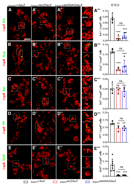 為了確認(rèn)這些減少現(xiàn)象是否發(fā)生在早期發(fā)育階段(即E15.5),檢測(cè)了胰腺E15.5的內(nèi)分泌系統(tǒng)。結(jié)果與對(duì)照相比,Insm1delSNAG和Insm1-null突變體中在觀察到一個(gè)類似的減少現(xiàn)象,包括胰島素,胰高血糖素,PP-和饑餓素陽性細(xì)胞(圖2)。然而,生長(zhǎng)抑素陽性細(xì)胞的數(shù)量在Insm1delSNAG或Insm1-null突變體中都沒有發(fā)生改變(圖2C–C”)。因此,Insm1delSNAG突變體中δ細(xì)胞數(shù)量的增加發(fā)生在E18.5,而不在E15.5。