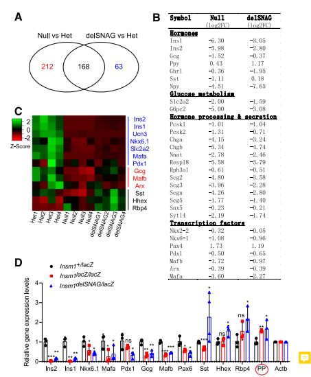 選用E18.5時(shí)Insm1delSNAG,Insm1 null和對(duì)照組小鼠的胰腺,利用RNA-seq研究Insm1delSNAG突變體胰臟內(nèi)的特異性基因表達(dá)。分析發(fā)現(xiàn)在Insm1delSNAG突變體胰腺中,共有231個(gè)基因顯著失調(diào),這些基因涉及發(fā)育和激素分泌方面。同時(shí)發(fā)現(xiàn)Insm1delSNAG和null 突變有顯著的差異基因交集,尤其是編碼激素的基因和與葡萄糖代謝和分泌調(diào)節(jié)相關(guān)的基因(圖5A、B)。Insm1delSNAG突變體中大約72.7%的差異基因也在Insm1 null突變體中被檢測(cè)到。然而與Insm1delSNAG突變體相比,Insm1 null突變體中有著更多的基因表達(dá)和數(shù)量上的變化。這些結(jié)果與在Insm1delSNAG突變體中發(fā)現(xiàn)比Insm1null突變體中β細(xì)胞更少這一現(xiàn)象一致。
