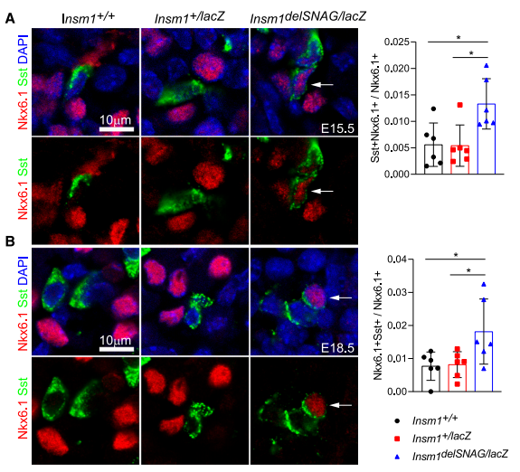 生長(zhǎng)抑素和胰島素或胰高血糖素的復(fù)合染色很少被觀察到,且在Insm1delSNAG突變體和對(duì)照小鼠之間沒有發(fā)現(xiàn)差異。但是在E15.5和E18.5時(shí)Insm1delSNAG突變體中,檢測(cè)到Sst和β細(xì)胞特異性轉(zhuǎn)錄因子Nkx6.1的復(fù)合染色信號(hào)增強(qiáng)(圖6A、B)。Sst與Nkx6.1的共表達(dá)表明Insm1delSNAG中δ細(xì)胞有可能會(huì)從β細(xì)胞轉(zhuǎn)化而來。