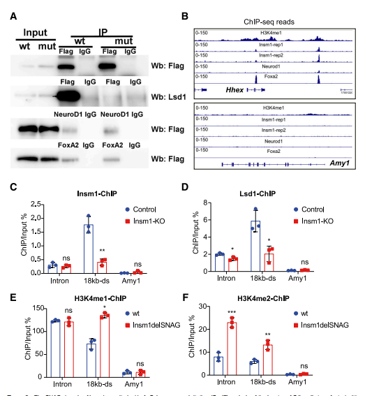 為了進(jìn)一步闡明Insm1的SNAG結(jié)構(gòu)域的分子功能,本研究通過免疫共沉淀法檢測(cè)與Insm1delSNAG相互作用的蛋白。本文檢測(cè)到Lsd1無法在轉(zhuǎn)染Insm1del-SNAG-Flag的SJb b細(xì)胞中被Flag抗體拉下來(圖8A)。這一結(jié)果與先前對(duì)垂體細(xì)胞的觀察結(jié)果一致。Insm1可以在胰腺β細(xì)胞中與NeuroD1和FoxA2互相作用。因此使用NeuroD1和FoxA2抗體在含有Insm1delSNAG-Flag或Insm1-Flag蛋白同一細(xì)胞裂解液中進(jìn)行免疫共沉淀,觀察到Insm1的SNAG域突變并沒有阻止Insm1與NeuroD1或FoxA2之間的相互作用(圖8A)。因此,Insm1delSNAG突變破壞了Insm1與Lsd1之間的相互作用,但不破壞Insm1與NeuroD1或FoxA2之間的相互作用。