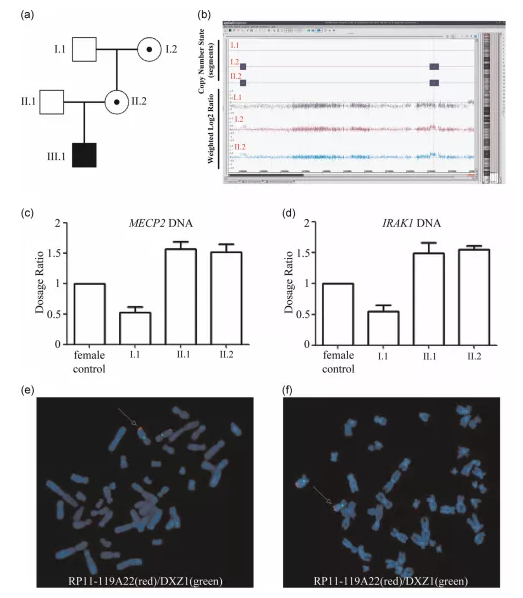 使用SNP微陣列檢測I.1、I.2和II.2的變化。在II.2和I.2(圖1b)中,在Xq28區(qū)域和Xq27.3區(qū)域分別顯示了437KB的重復和284KB的重復,這表明Xq28和Xq27.3重復是母系遺傳的。Xq28區(qū)域包含13個在線孟德爾人遺傳(OMIM)基因(包括MECP2、IRAK1、L1CAM、NAA10和HCFC1)。通過qRT-PCR以驗證結果,在男性I.1中檢測到MECP2和IRAK1一個基因劑量的拷貝,而在正常對照女性中檢測到兩個拷貝,在I.2和II.2中檢測到三個拷貝(圖1c,d)。對女性I.2和II.2的中期染色體進行FISH分析,發(fā)現(xiàn)含有MECP2的探針RP11-119A22僅在Xq28處有信號,這表明Xq28重復是串聯(lián)的,沒有整合到基因組的其他地方(圖1e,f)。