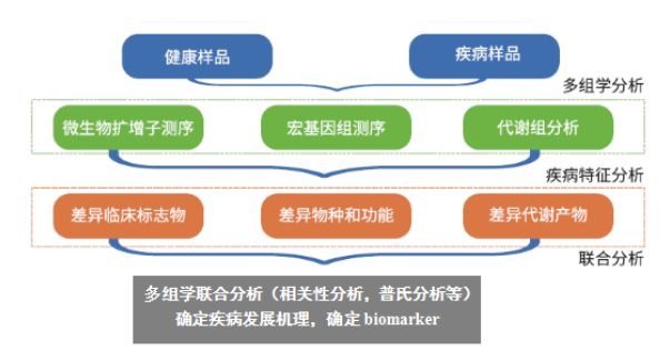 ?微生物組測序(主要指擴增子測序與宏基因組測序)可提供微生物組成、基因功能和豐度信息,而代謝組學是研究生物體中代謝產(chǎn)物變化的科學。生物科學研究過程復雜,單—組學往往無法全面的解決生物學問題,多組學就顯得尤為重要。近年來,隨著微生物組學研究的不斷發(fā)展和持續(xù)火熱,越來越多的研究者開始將微生物組學和代謝組學聯(lián)合起來,從物種、基因以及代謝產(chǎn)物等水平共同解釋科學問題,更好地理解疾病過程及機體內(nèi)物質(zhì)的代謝途徑,還有助于發(fā)現(xiàn)疾病的生物標記以更進—步應用千臨床輔助診斷。