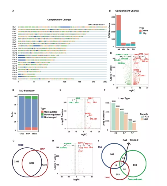 在腫瘤發(fā)生過(guò)程中,染色質(zhì)compartments會(huì)進(jìn)行轉(zhuǎn)換。與HNP相比,CH22的每條染色體中都發(fā)現(xiàn)了compartments轉(zhuǎn)換,尤其是在chr1、9、13-16和22(圖3A)。HNP中9.99%的compartments A在CH22中為compartments B,6.06%的compartments B在CH22中為compartments A,從A到B的轉(zhuǎn)換中基因的表達(dá)顯著下調(diào)(p=1.08 e-74 ),反之亦然(p=4.11 e- 47 )。