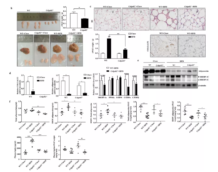 脂聯(lián)素對肝細(xì)胞有重要的抗脂肪變性作用。因此,為了檢測Colgalt2對脂聯(lián)素的影響,作者研究了脂聯(lián)素在白色脂肪組織WAT中的表達、血漿總脂聯(lián)素和HMW脂聯(lián)素水平。出人意料的是,在Colgalt2缺陷的小鼠中觀察到部分脂肪營養(yǎng)不良。與WT小鼠相比,Colgalt2?/?小鼠(6周齡)的eWAT體重降低(圖4b)。此外,在HFD喂養(yǎng)16周后,Colgalt2敲除抑制小鼠的脂肪組織擴張,而在WT小鼠脂肪組織明顯體積增大(圖4b)。脂肪形成由復(fù)雜的轉(zhuǎn)錄因子網(wǎng)絡(luò)(C/EBP家族成員,PPARγ,SREBP-1c等) 控制,這些因子在脂聯(lián)素基因表達、代謝和其他脂肪特異性基因中發(fā)揮重要作用。在HFD喂養(yǎng)的Colgalt2?/?小鼠中,C/EBPα、C/EBPβ和脂肪生成標(biāo)記物SREBP1a有降低趨勢(圖4d)。此外,在HFD喂養(yǎng)的Colgalt2?/?小鼠中,p-SREBP-1c和n-SREBP- 1c蛋白表達明顯下調(diào)(圖4e)。