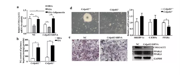 為了探究COLGALT2缺乏在脂肪萎縮中的作用, 在3T3-L1細(xì)胞中誘導(dǎo)了前脂肪細(xì)胞分化,從Colgalt2?/?和WT小鼠的eWAT中分離原代前脂肪細(xì)胞(圖6d)。油紅 O染色結(jié)果顯示干擾Colgalt2降低了前脂肪細(xì)胞分化為脂肪細(xì)胞(圖6e)。此外,干擾Colgalt2下調(diào)了脂肪前細(xì)胞向脂肪細(xì)胞分化過程中PPARγ的表達(圖6e)。此外,從Colgalt2?/?和WT小鼠的eWAT中分離出原代前脂肪細(xì)胞,結(jié)果顯示,Colgalt2敲除降低了PPARγ mRNA水平(圖6d)。然而,來自Colgalt2?/?和WT小鼠的原代前脂肪細(xì)胞分化后,C/EBPα、C/EBPβ或SREBP-1c mRNA水平無顯著差異。