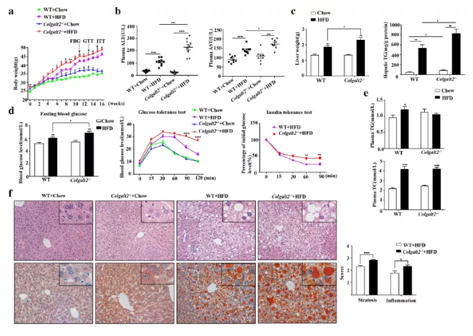 血液ALT和AST水平表明HFD喂養(yǎng)的Colgalt2?/?小鼠的肝損傷加重。HFD喂養(yǎng)的Colgalt2?/?小鼠血漿中ALT和AST水平分別比WT小鼠高2倍和1.2倍(圖2b)。然而,HFD喂養(yǎng)的Colgalt2?/?小鼠和WT小鼠的血漿TG、TC和HDL水平?jīng)]有顯著差異(圖2e)。此外,空腹血糖(FBG)、GTT和ITT表明HFD小鼠的胰島素敏感性受損(圖2c)。在HFD喂養(yǎng)的小鼠中,與WT小鼠相比Colgalt2?/?小鼠的FBG水平在11周后增加了13%(圖2c)。GTT和ITT檢測發(fā)現(xiàn)HFD小鼠的循環(huán)葡萄糖水平高于正常飼料喂養(yǎng)的小鼠,且在Colgalt2敲除小鼠中也明顯增加(圖2c)。