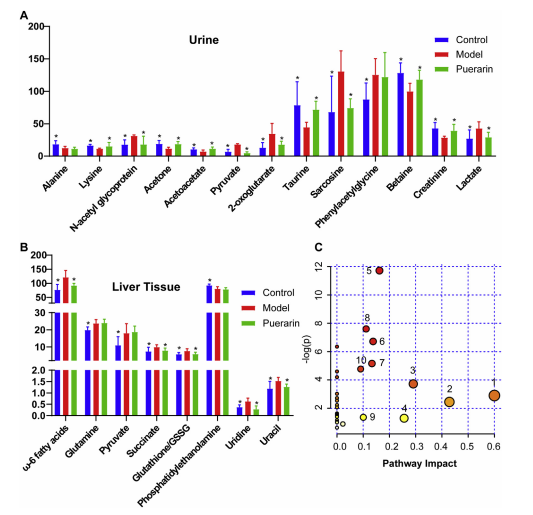 基于來自 OPLS-DA 模型的 VIP 值(VIP ≥ 1)和來自單變量統(tǒng)計分析的 P 值 (P < 0.05),8 和 13顯著改變與 NASH 相關(guān)的內(nèi)源性代謝物是分別被鑒定為肝組織和尿液中的潛在生物標(biāo)志物(圖 5A 和 B,以及表 1)。肝臟代謝特征NASH 模型小鼠的 w-6 脂肪酸水平升高,谷氨酰胺、丙酮酸、琥珀酸、谷胱甘肽/GSSG、尿苷和尿嘧啶,連同的磷脂酰乙醇胺水平降低。關(guān)于健康控制與對照組相比,模型組尿中n -乙酰糖蛋白(NAG)、丙酮酸、2-氧戊二酸、肌氨酸、苯乙酰甘氨酸、乳酸水平升高,丙氨酸、賴氨酸、丙酮、乙酰乙酸、?;撬?、甜菜堿、肌酐水平降低。此外,除了肝臟組織中的谷氨酰胺、丙酮酸和磷脂酰乙醇胺(PE)以及尿液中的丙氨酸和苯乙酰甘氨酸外,所有與NASH相關(guān)的潛在生物標(biāo)志物均被葛根素顯著逆轉(zhuǎn)。
