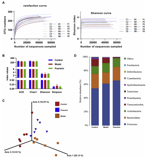廣州中醫(yī)藥大學(xué)藥學(xué)院、 廣東藥科大學(xué)中醫(yī)學(xué)院、中山大學(xué)附屬第六醫(yī)院聯(lián)合在Journal of Pharmaceutical and Biomedical Analysis雜志發(fā)表以“Therapeutic potential of puerarin against methionine-choline-defificient diet-induced non-alcoholic steatohepatitis determined by combination of 1H NMR spectroscopy-based metabonomics and 16S rRNA gene sequencing”為題的文章,揭示葛根素對非酒精性脂肪性肝炎的治療方向的相關(guān)研發(fā)現(xiàn),從而為非酒精性脂肪性肝病的治療提出新的見解理論基礎(chǔ)。其中微生物多樣性檢測由百邁客協(xié)助完成。
